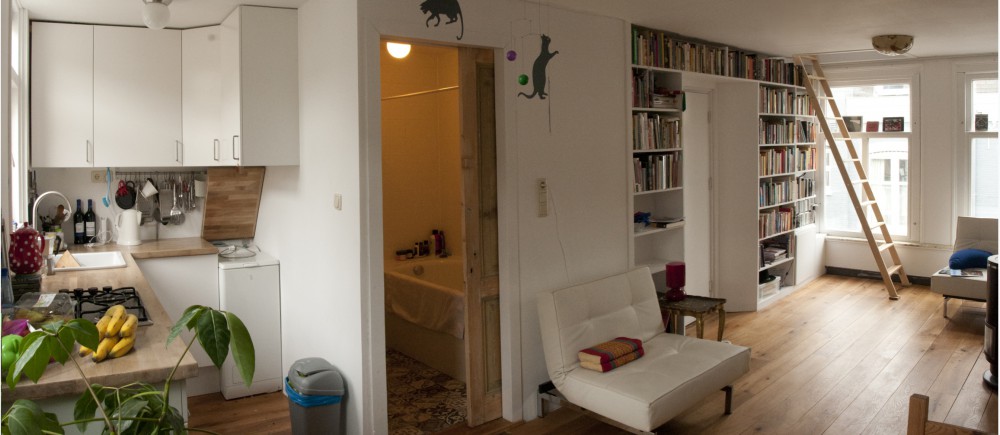 Vera wist al precies wat ze wilde toen ze me vroeg haar 19e eeuwse appartementje te verbouwen. Zo kwamen we snel tot een plan. Behalve het verplaatsen van de toegangsdeur en het uitnemen van een tussenmuurtje, waardoor een wat grotere badkamer mogelijk werd met een ligbad, en de totale ruimte veel opener werd met een toegankelijke, kompakte keuken, kreeg ze ook een binnenladder met afsluitbaar luik naar haar slaapkamer en een grote plankenkast rondom de nieuwe entree.